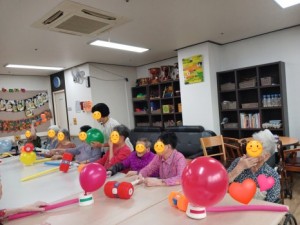 어르신들이 백업봉에 풍선을 붙이고 둘이서 짝이되어 풍선터트리기