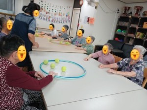 어르신들과 함께 공을 튕겨서 훌라후프안에 넣고,